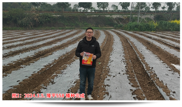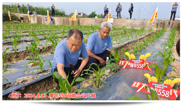 回想年前說要召開苗期會議的時候,大家都有點不知所措,因為沒有先例,客戶也并不看好苗期會議呈現的效果。決定了要做,那就全力以赴,第一個問題就是示范田的選點,要考慮播種時間、地塊條件、地塊面積、交通便捷、人員配合等,權衡各要素最終確定在樂山夾江找地。樂山夾江水源條件好有東風堰灌溉,土質肥沃常年種植蔬菜、藥材,地勢平坦面積規整更易找到幾畝連片地塊,播種時間較早能夠保證4月中旬苗子適合觀摩,種植戶經驗豐富懂得控制密度和水肥管理。從年前初選溝通,到最后落實,由于交通、前茬、面積等因素,前后也溝通了6位種植戶、經歷了3次換地,才最終在2月20日確定了地塊,并于3月5日完成播種。設計之初首先考慮的就是密度,該地塊密度有2種設計,一是寬窄行(雙株)的3200株/畝,二是等行距(單株)2600株/畝,同時保證外觀性狀和產量性狀都有較高的體現。其次是保證整田無雜草,苗齊苗壯,從播種短短一個月時間內我去查看了4次。播種時已做好了地塊除草,確定好行距、株距,然后每窩3粒播種;第一次查看,及時整理薄膜的遮蓋,了解墑情、苗情,如出現整箱出苗不好,及時灌溉保苗;出苗整齊后,及時補苗肥,促進長勢;苗期會議前,插牌、美化地塊,間苗,祛除弱苗,展現示范地的最佳狀態。田間管理實操工作繁重且枯燥,但當看見客戶在地里笑著拍攝隆平558的情景,就讓我依舊相信每一份努力的背后,一定會有驚喜!